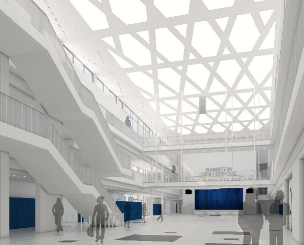 Auf dem Gelände der Ramstein Air Base wurde eine neue dreigeschossige High-School für etwa 1000 Schüler der Klassenstufe 9 bis 12 gebaut. Ausgehend von der überdachten zentralen Common Area mit einer Bühne entstanden 5 eigenständige Gebäudebereiche: im Osten der Verwaltungsbereich inkl. Medienzentrum (A), im Süden die blockartig ausgebildeten Unterrichtsbereiche (B und C), im Westen die Sporthalle (D) und im Norden weitere Unterrichtsbereiche inkl. Musikbereich und Küche (E). Wir erstellten 380 Schal- und Bewehrungspläne für das gesamte Gebäude. Aufgrund von Anforderungen durch die sogenannten Force Protection mussten aufwändige Bewehrungsführungen realisiert werden.